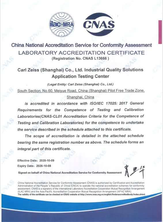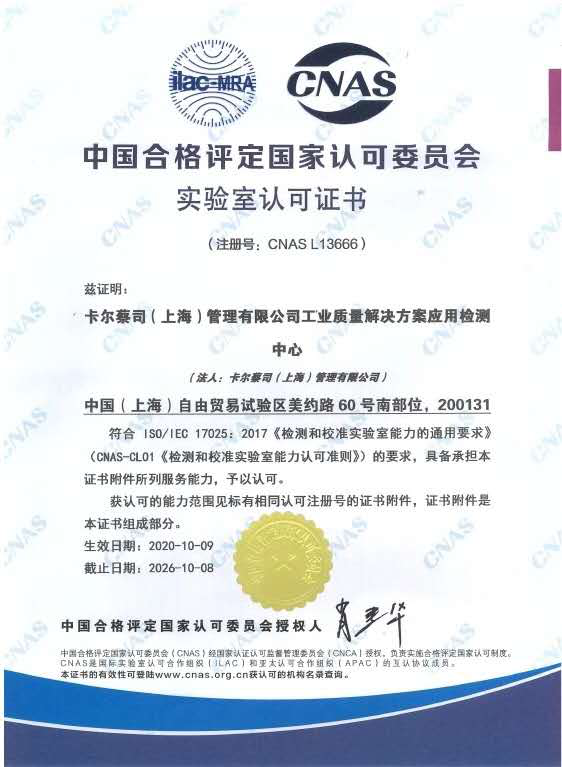 近日,卡尔阳江蔡司(上海)管理有限公司工业质量解决方案应用检测中心经过中国合格评定国家认可委员会(CNAS)严格的现场评审和后续考察,正式通过了最终审评并获得实验室国家认可证书。至此,标志着蔡司应用检测中心具有了国家及国际认可的管理水平和校准能力。